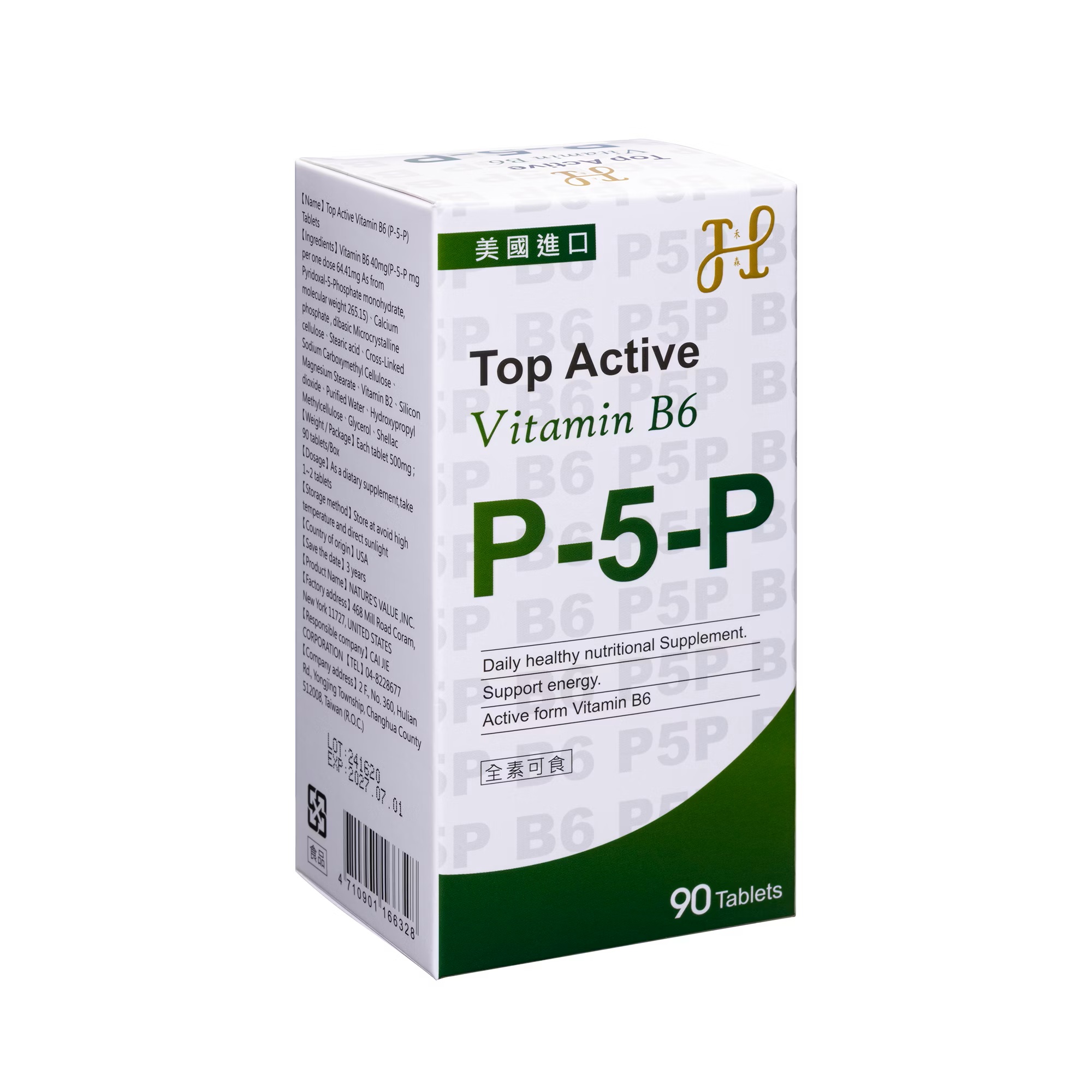 成  分:  維生素B6含量40mg,(P-5-P完整含量64.41mg,P-5-P分子量為265.15)